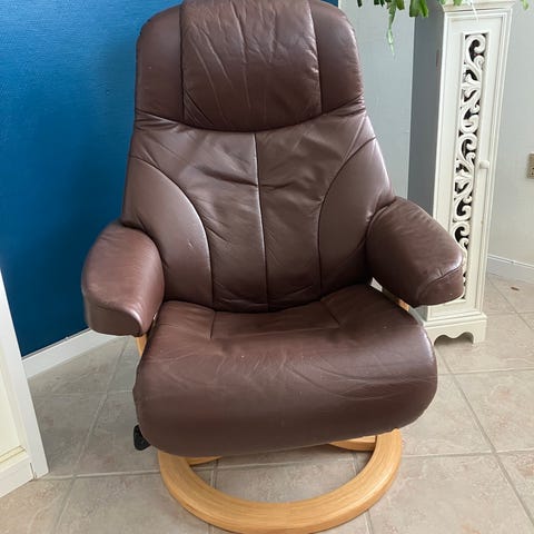 Høj lænestol i mørke brunt læder med sort stjernefod . Trinløs vippe funktion med lås