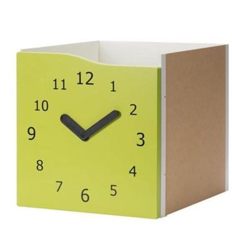 IKEA Kallax reol i højglans med flere åbne rum i hvid. Reolen har kvadratiske rum, hvoraf et er udstyret med en blå front med urmotiv, og et rum har en hvid låge. Egnet til opbevaring af legetøj, bøger eller andre ting på børneværelse eller i opholdsrum.