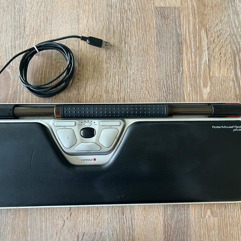 Contour Rollermouse Red ergonomisk mus i sort. En centreret pegeenhed til brug foran tastaturet, hvor hænderne hviler på den integrerede håndledsstøtte. Enheden har rullestang til markørstyring samt knapper til klik og navigation. Velegnet til kontorarbejde og andre opgaver, hvor musen bruges mange timer dagligt, og hvor der ønskes en mere ergonomisk arbejdsstilling foran computeren.