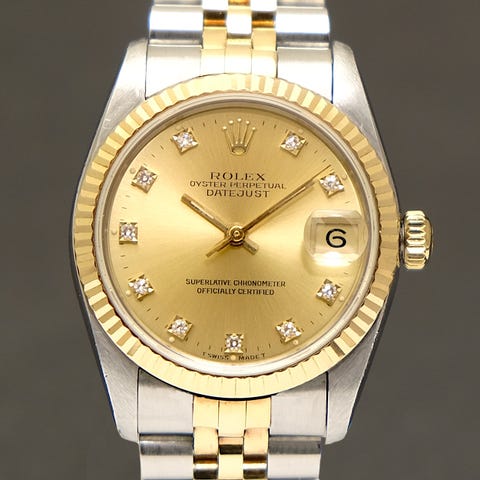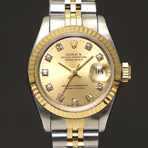 Rolex Datejust 69173 med bokse og papirer fra 1985. Desuden servicepapirer. Det klassiske dame Datejust i 26 mm, som her kommer med safirglas, den flotte Champagne skive og på Jubilee lænke. Fremstår i flot stand. Eneste brugsspor er få og små hairlines. Værket er med automatik og quick set dato.