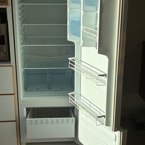 Gram køle-fryseskab i hvid. Skabet har køledel øverst med flere glashylder, grøntsagsskuffe og dørhylder samt frysedel nederst med tre gennemskuelige fryseskuffer. Egnet til almindelig husholdningsbrug til opbevaring af køle- og frostvarer. Manual medfølger ifølge billederne.