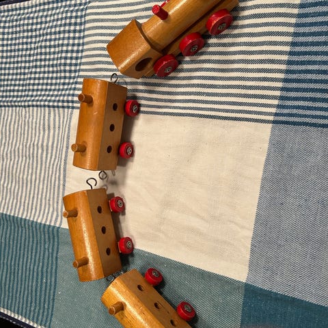 Træ legetøjstog med flere vogne og tilhørende remise. Toget består af et lokomotiv og flere åbne godsvogne i lyst træ. Remisen er i træ med grønne sider og rødt tag samt døre, der kan åbnes. Sættet er egnet som legetøj til børn eller som dekoration, og kan bruges på gulv eller bord uden skinner.