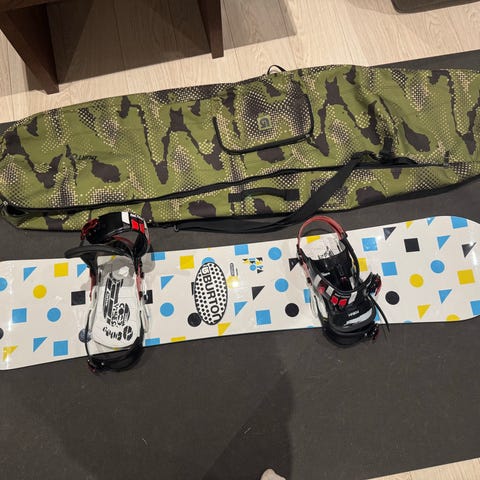 Burton Custom snowboard med hvide Burton bindinger. Snowboardet har grafisk design på top og bund i lyse og grå nuancer. Bindingerne er justerbare og monteret på brættet. Velegnet til brug i alpinområde til almindelig snowboardkørsel. Størrelse, længde og mål fremgår ikke af billederne og bør derfor måles ved interesse.