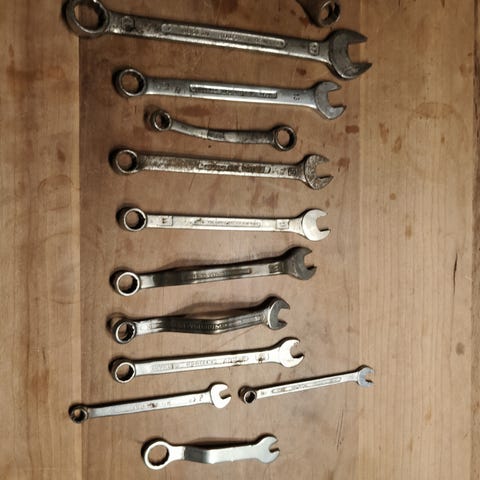 Ukendt mærke håndværktøj sæt fastnøgler skiftenøgle og luftblæsepistol metal