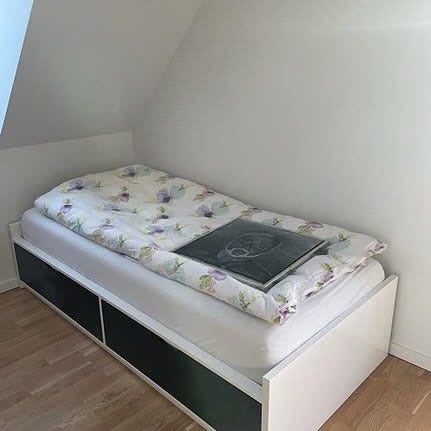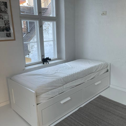 IKEA seng med skuffer i hvid. Sengen er en enkeltseng med tre integrerede opbevaringsskuffer under liggefladen. Velegnet til soveværelse, børneværelse eller gæsteværelse, hvor der er behov for ekstra opbevaringsplads til sengetøj, tøj eller andre ting.