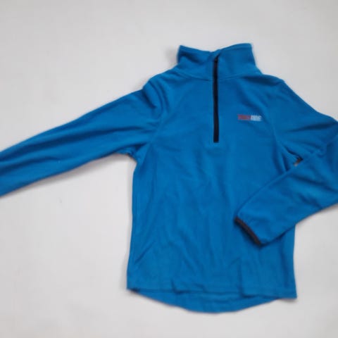 Børne fleecetrøje med lynlås i halsen i str. 116 i lilla. Trøjen har høj hals og er velegnet som mellemlag eller som let overdel til hverdag og udendørs brug. På billedet ses også et par strømper, som eventuelt kan indgå i samme annonce efter sælgers ønske.