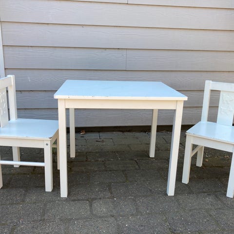 IKEA Kritter børnebord og stol i hvid. Sættet består af et lille firkantet bord og en matchende stol med udskåret motiv i ryglænet. Egnet til brug på børneværelset til leg, tegning og andre aktiviteter. Overfladen er glat og nem at tørre af. Velegnet til mindre børn, der har brug for et lavt bord og en stol i passende størrelse.