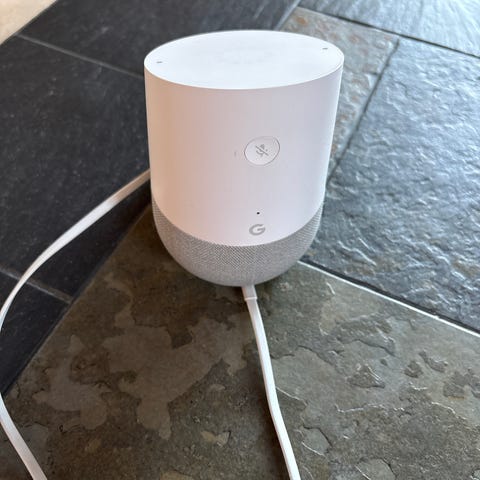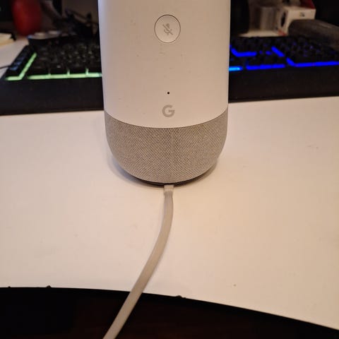 Google Home smart højttaler i hvid. Enheden fungerer som stemmestyret højttaler med indbygget Google.