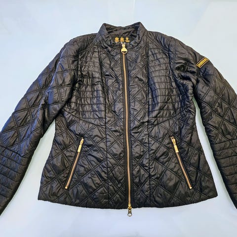 Jakken har den ikoniske ternede foring og aftagelig hætte - perfekt til både by og natur. Størrelse 10 UK, medium.