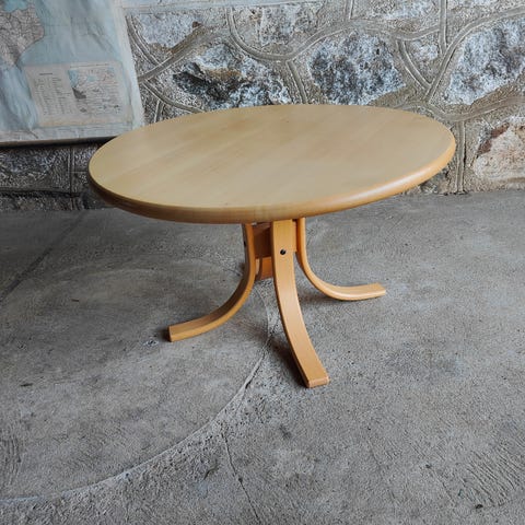 Ovalt sofabord i lyst træ med rundede kanter og ben i massiv bøg. Bordet har fire ben forbundet med krydsstiver under bordpladen, hvilket giver ekstra stabilitet. Egnet som sofabord i stue eller opholdsrum.