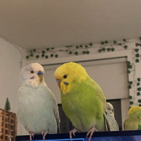 Den blå er en han og den hvide en hun de er et par og skal ikke skilles af de er omring 1 år og er nogen meget hyggelige fugle som elsker selvskab de bor i et kæmpe bur og elsker og komme ud og flyve
