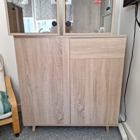 Pasadena SM914 Vitrine, 3 hylder, 2 højrehængte låger, 1 skuffe og med sokkel og indbygget lys i.