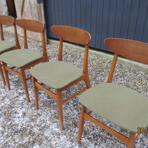 4 stk dansk designede stole I teaktræ af farstrup model 210. Stolene er pæne, kunne dog bruge lidt olie og lim. En enkelt stol har tidligere haft skruer i, men er taget ud. Prisen er for alle stolene. # retro, teak, teaktræ, antik, vintage, dansk design, danish design, moderne, stol, stole.