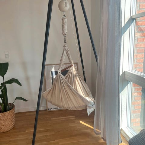 Slyngevugge fra Natures Sway inkl. madras og afstivermadras og motor fra Moonboon. Vi har købt det brugt, og benyttet den til et barn i tre måneder.