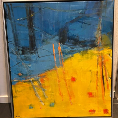 Rød skovbund maleri i abstrakt stil, udført i akrylmaling på lærred. Farvekompositionen domineres af rød, blå og gul med grafiske linjer og felter. På bagsiden er værket markeret med titlen "Rød skovbund" og målene 80 x 70 cm. Maleriet er opspændt på ramme og klar til ophængning, egnet til ophæng i stue, kontor eller andre opholdsrum.