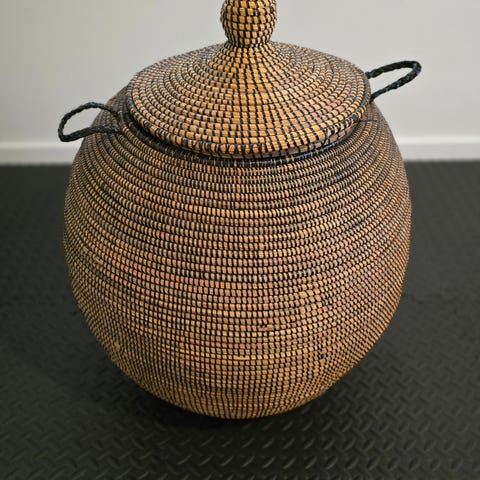 En anderledes opbevaringskurv med låg i naturflet. Hel og pæn