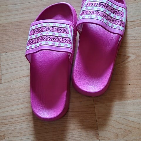 Sjove og søde lyserøde hjemmesko eller strand-/bade sandaler. Passer Str 37 eller 38 med sjov sort "fnug-trold". Bløde og behagelige. Alt skumplast. Nye og ubrugte. Prisen er fast. KAN OGSÅ SENDES