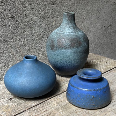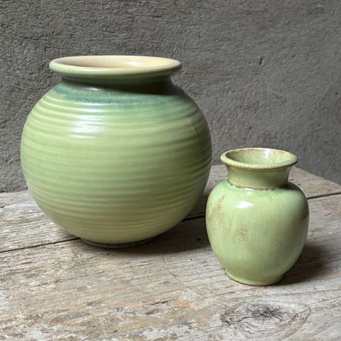 Keramikvase i brun og grå glasur med geometrisk reliefmønster på den nederste del. Vasen har en bred, rund bund og en smallere hals med rund åbning foroven. Egnet til dekoration eller til mindre buketter og enkelte blomsterstængler. Materialet fremstår som glaseret keramik med struktureret overflade på midterstykket og glattere glasur på hals og kant.