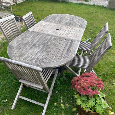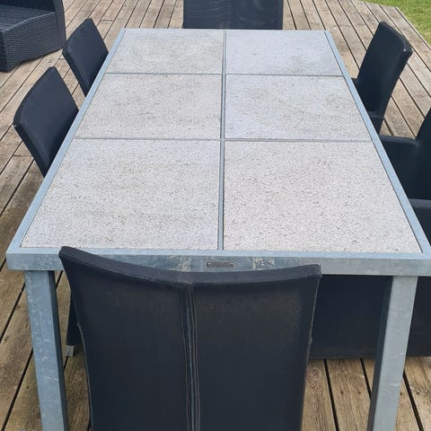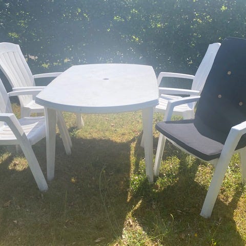 Havebord med 4 matchende stole i hvidt design. Rektangulært bord med plade i kontrastfarve. Sættet er egnet til udendørs brug på terrasse eller i have. På billederne ses flere steder med afskalninger, slid og skader på stel og ryglæn, som bør udbedres eller accepteres ved brug. Velegnet som havesæt til spise- og hyggeområde udendørs.