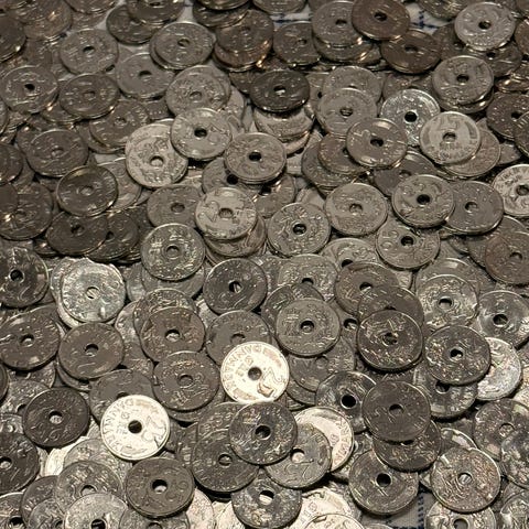 Blandet lot af danske 25-øre mønter i plastboks. Mønterne er med hul i midten og varierer i årgange Egnet til samling, dekoration, hobbyprojekter eller håndarbejde, hvor der ønskes originale danske mønter som materiale.