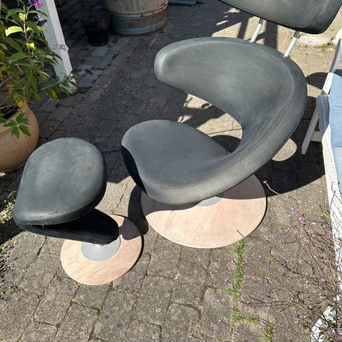 Flotte og velholdte Peel Club Varier stole i sort læder sælges for 12.000 kr samlet.