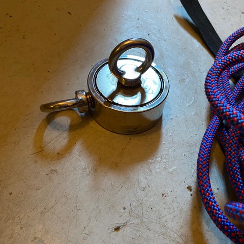 Magnetfiskesæt bestående af magnetkroge, karabinhager og gult reb samlet i en hård plastkuffert. Sættet kan anvendes til magnetfiskeri fra broer, kajer eller andre steder, hvor der ønskes opsamling af metalgenstande fra vand. Kufferten beskytter udstyret under transport og opbevaring, og de medfølgende karabinhager gør det muligt at fastgøre reb og magneter sikkert.