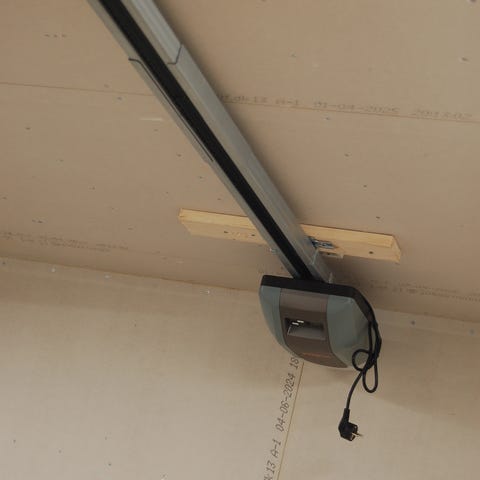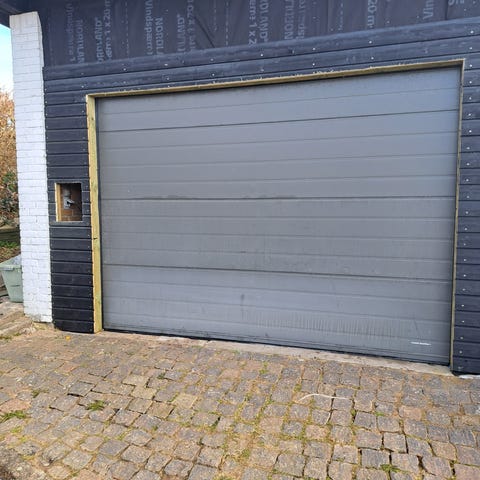 Stor Garageport/ledhejseport i sektioner og fjedermekanisme i metal. Består af portsektioner, skinner, fjedre, aksel og wirer til montering af en garageport.