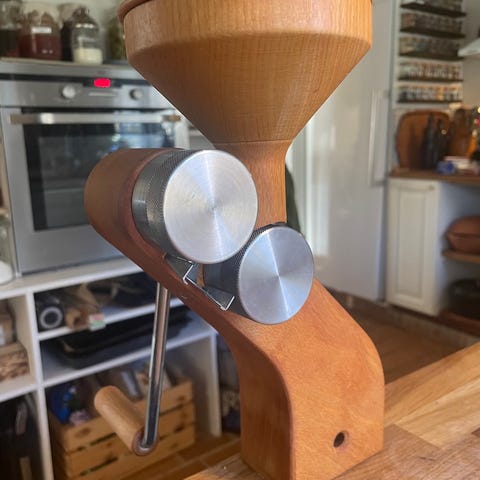 Smuk håndbetjent kornkværn i træ.