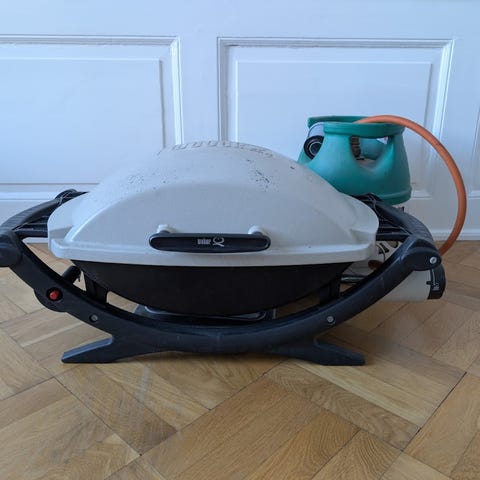 Weber Q2200N gasgrill med stativ. Kompakt udendørs gasgrill med låg og to sideborde, egnet til grillning på terrasse, altan eller i have. Grillen står på et fritstående stativ, som giver en behagelig arbejdshøjde og stabil placering under brug.