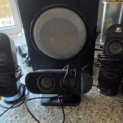 Logitech højttalersæt med subwoofer. Sættet består af en subwooferenhed og to satellithøjttalere, der forbindes med kabler. Der medfølger kablet fjernbetjening til justering af lydstyrke og tænd/sluk. Velegnet til brug med computer eller anden lydkilde via kabeltilslutning.