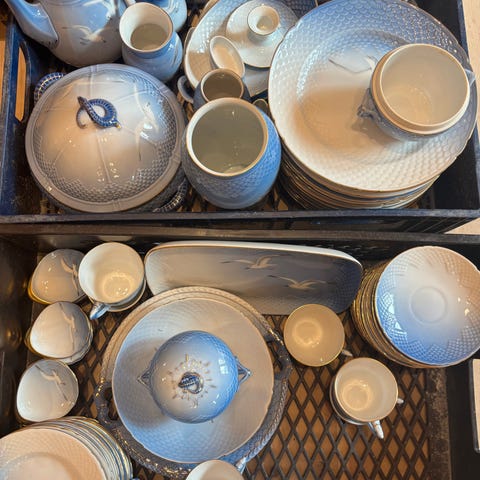 Porcelæn, tallerken, mågestel m/guldkant, 13 stk kaffekopper, 14 stk underkopper, 12 kagetallerkner 15, 5 cm.