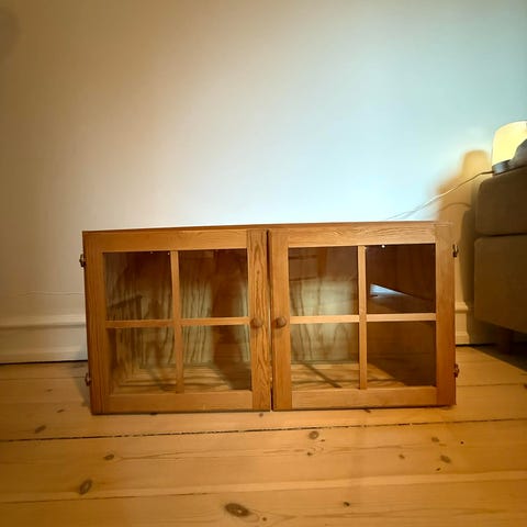 hængevitrineskab i massiv egetræ, mat lak, med glaslåger og glashylder,