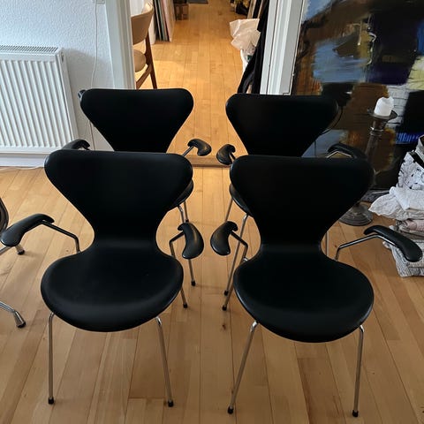 7’er stole fra Fritz Hansen, ny polstret i sort læder, semi-anilin. Som nye.