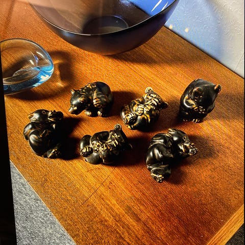 Keramik bjørne figurer i sort. Sættet består af flere bjørne i forskellige størrelser, herunder stående, liggende og siddende figurer. Egnet som dekoration på hylde, reol eller skænk i stue, værelse eller kontor.