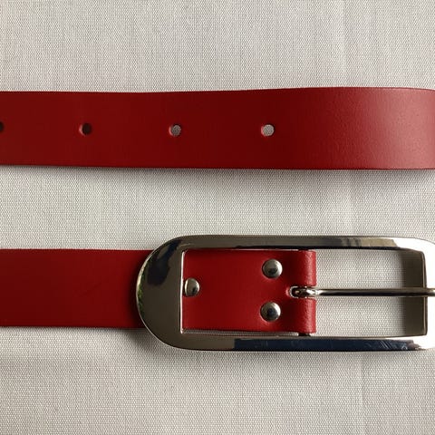 Ubrugt Rød / Vinrød Bælte til kvinde. Bæltet er bredt med stor, firkantet spænde og rynket detalje langs midterstykket. Velegnet til brug i taljen over kjoler, tunikaer eller bluser. Materialet fremstår som kunstlæder/læderlook. Længde og bredde fremgår af billederne med målebånd.