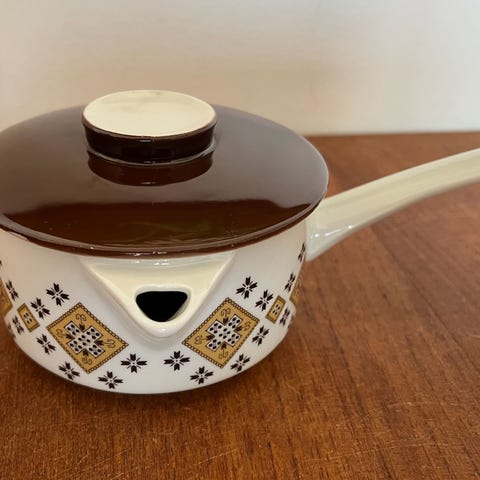 Smørkande med låg og hank i porcelæn fra stellet Gul Dan-ild fra Lyngby porcelæn.