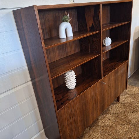 Reol i palisander i Dansk retro design, fra ikke ryger hjem. Bud modtages.