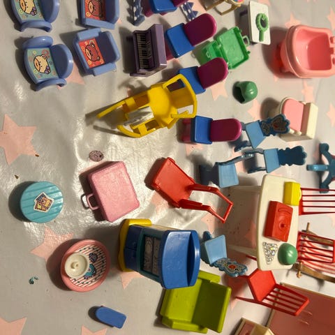 Lundby dukkehus spisebordssæt med rundt bord og fem farvede stole. Sættet består af et rundt bord på fod og fem matchende stole i forskellige pastelfarver. Møblerne er i miniaturestørrelse egnet til brug i Lundby dukkehuse eller andre dukkehuse i tilsvarende skala. Velegnet som tilbehør til leg med dukkehuse og indretning af miniature spisestue.sælges plus evt porto
