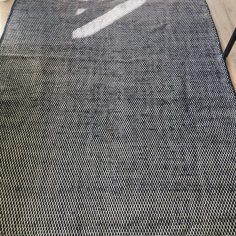 Linie Design tæppe i sort/råhvide nuancer. Fladvævet struktur med små, tætte felter i lys og mørk tone, som giver et roligt, grafisk udtryk. Egnet til brug i stue, spisestue eller entré på hårde gulve som træ.