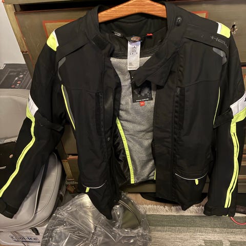 Motorcykel jakke og bukser sæt i sort. Sættet består af en langærmet jakke med forstærkede områder på skuldre og albuer samt matchende bukser med forstærkede felter på knæene. Jakken har flere justerbare remme i taljen og ved ærmerne for bedre pasform. Bukserne har vidde ved anklerne med lukning forneden, så de kan tilpasses over støvler. Sættet er egnet som kørebeklædning til motorcykel med fokus på beskyttelse og komfort under kørsel. Endvidere er sættet med aftageligt foer i termo.