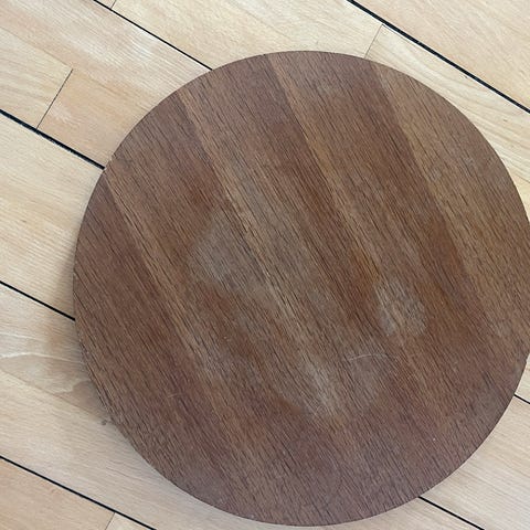 Halvrund bordplade med skrå kant,beklædt med hvid formica.