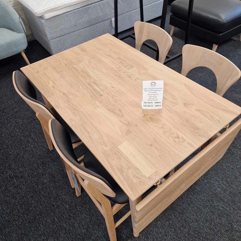 Spisebordet måler 75 x 75 cm, og når klappen er slået ud måler bordet 115 cm.