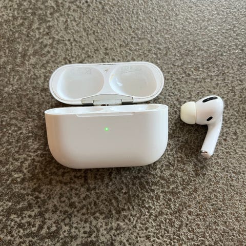 Apple AirPods Pro headset i hvid. Trådløse in-ear høretelefoner med opladningsetui. Velegnet til brug med Apple-enheder via Bluetooth. Leveres med etui og udskiftelige ørepropper som vist på billederne.