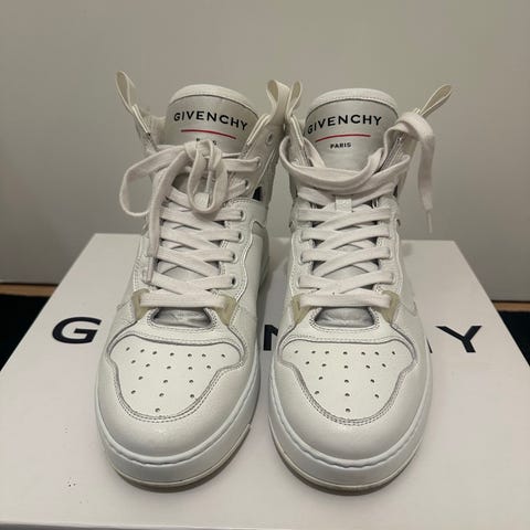 Givenchy sneakers i str. 37. Modellen er en hvid lædersneaker med bred sort elastik over vristen med Givenchy-logo. Skoene har sort hælkappe med logo og lys gummisål. Indvendig læderforing. Velegnet som hverdagssko eller til mere afslappede outfits.