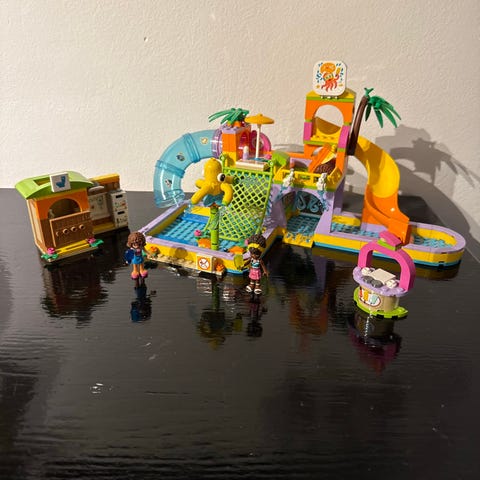 LEGO Friends legesæt med poolområde, rutsjebane og lille bygning med detaljer som palmer, siddepladser og tilbehør. Sættet indeholder minidukker og forskellige småelementer til leg i et fritids- og poolmiljø. Egnet til rolleleg og opbygning af egne Friends-scener.