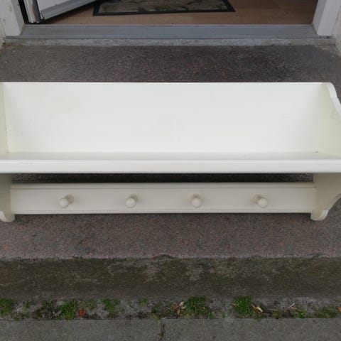 Børnehylde med knager i blå. Hylden har en dekorativ front med børnemotiv og flere knager under til ophæng af for eksempel tøj eller tilbehør. Velegnet til børneværelse eller entré, hvor der er behov for ekstra opbevaring og ophæng i børnehøjde.