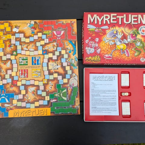 Myretuen brætspil i 30 års jubilæumsudgave fra 2020. Spillet indeholder spilleplade, regler og spilledele/klodser samt terninger, som vist på billederne. Familiespil hvor spillerne bevæger sig rundt i myretuen efter spillets regler. Egnet til flere spillere og kan spilles af både børn og voksne afhængigt af anbefalet aldersgruppe på æsken.