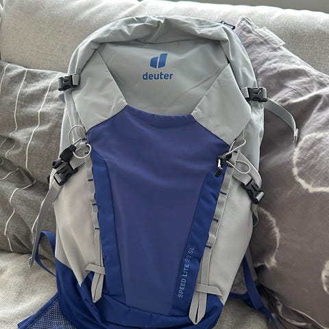 Deuter Futura 32 liter vandrerygsæk købt anslået 2009 og har været med på et par vandreture i udlandet. Perfekt til vandring med overnatning og rejser op til 1 uge.