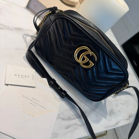 Tidligere ejer har ifølge billede af kvitteringen købt den i Gucci i New York.