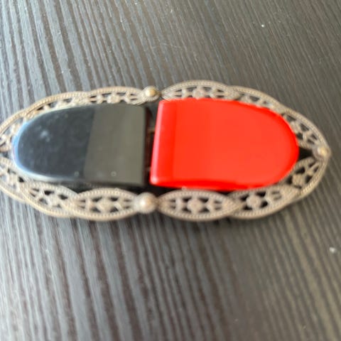 Rigtig sjov ting. En kæmpe stor tøjklemme, der er lavet af træ. Den er lyserød. Kan både bruges som pynt, men os til praktiske ting.